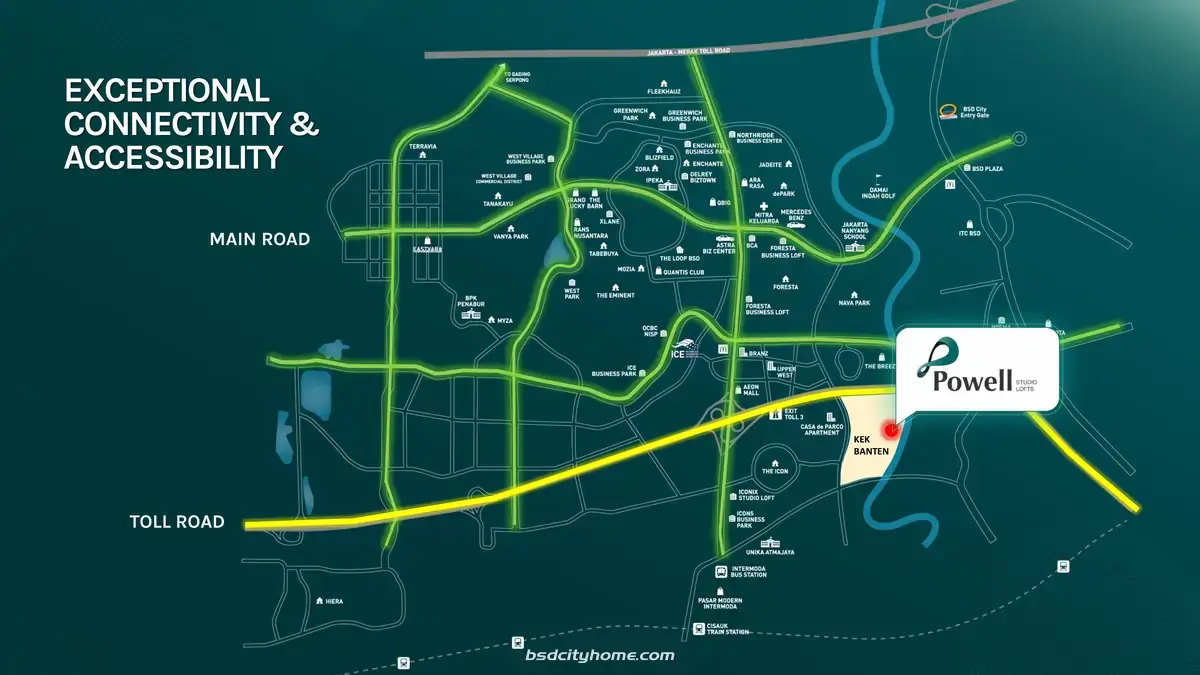 Dimana lokasi Powell Studio Lofts BSD? Berada di Kawasan Ekonomi Khusus (KEK) Banten yang terintegrasi seluas kurang lebih 60 hektar, Powell Studio Loft berlokasikan di KEK Banten Area 1 seperti terlihat pada gambar peta lokasi dibawah. Powell studio lofts BSD dekat dengan berbagai kawasan residensial seperti: apartemen Casa de Parco, perumahan The Icon, The Breeze, apartemen Upper West BSD, dan Branz BSD, perumahan mewah Navapark, dan Foresta. Lokasi Powell juga berdekatan dengan Unika Atmajaya, Intermoda BSD, ICE dan exit tol 3.